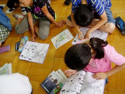 修学旅行中の主な見学先や経路,注意点について話を聞いたり,大切な事柄を『しおり』に書き込んだりしていました。