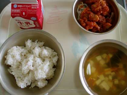 今日は『鶏肉のチリソース・パリパリはるさめ』という新メニューが登場しました。子どもたちからは,「ぱりぱりして美味しかった。」「ちょっとお菓子みたい。」と評判の声が聞かれました。