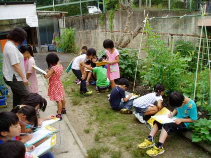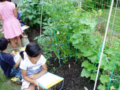 2年生が育てているミニトマトや枝豆は大きな葉を茂らせ,実をつけ始めました。子どもたちは,その様子を絵と言葉で記録カードに書き留めていました。