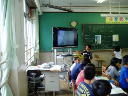 5年生の教室では,『庄内平野は,どうして米作りに適しているのでしょうか?』という学習問題について,子どもたちが話し合いの進め役や記録役をしながら学習に取り組んでいました。