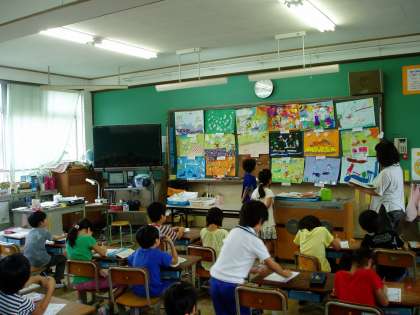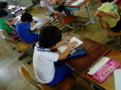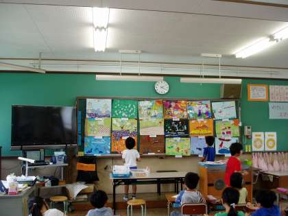 2年生は,図画工作科で作り上げた作品を鑑賞し,お互いの作品で工夫しているところや気に入ったところをカードに書き込み,伝え合っていました。