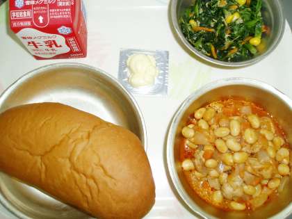今日の給食は大豆と鶏肉のトマト煮でした。暑い夏には,トマトの酸味がピッタリです。