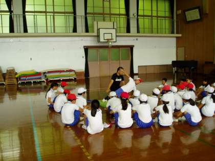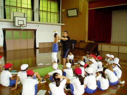 5年生の体育では,運動会での演技『組体操』の練習が始まりました。夏休み中に各家庭でも練習できる『一人技』のポイントを知り,練習に取り組んでいました。