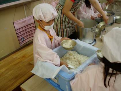 今日の給食は,『さんまのかわり煮』『ほうれんそうのおかか煮』『豚汁』でした。夏休み明け,ひとまわり大きくなった1年生は,給食の配膳も上手になりました。みんなで協力して手際よく仕事をすすめていました。