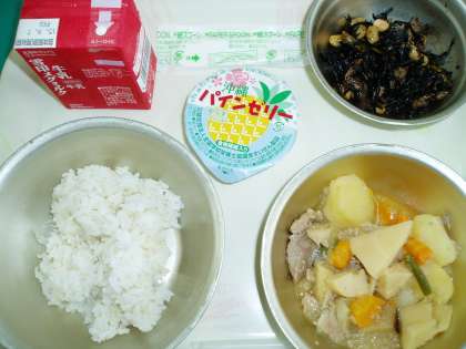 今日の給食は,『豚肉と野菜の煮つけ』『ひじき豆』それに『パインゼリー』がデザートとして添えられました。