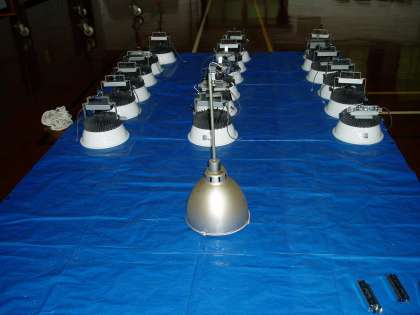 ブルーシートの上に置かれている手前が古い電燈で,その後ろに並べられているのが新しいLEDの電燈になります。