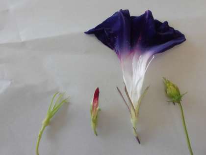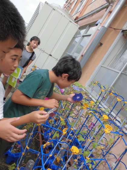 日ごろ見慣れたアサガオですが,「おしべ」と「めしべ」を,花が開く前と,後の状態を見ました。