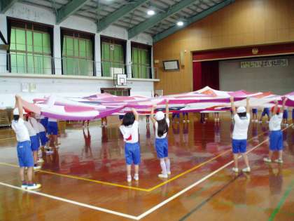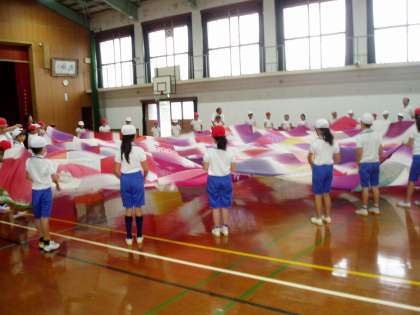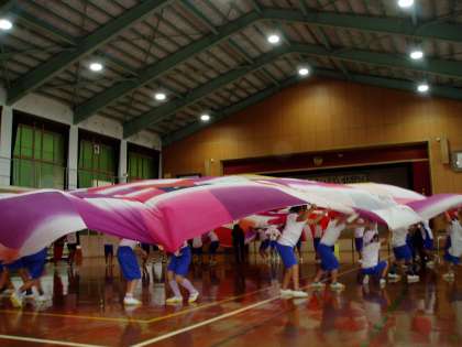 今日は,あすなろ学級と3年生が『バルーン』の練習を体育館で行いました。全員が音楽を聞きながら,息ピッタリにバルーンを上下させる練習に取り組んでいました。