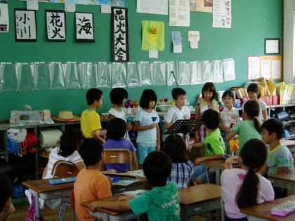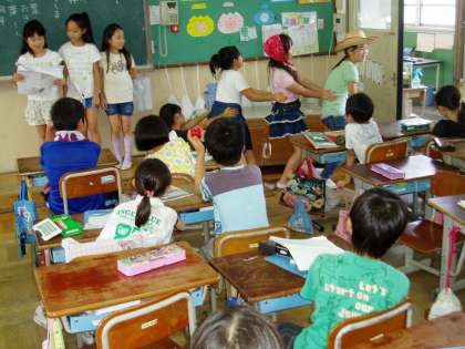 3年生は,1年生に分かりやすく学校行事を紹介しようとグループで工夫を凝らしています。言葉で紹介するだけではなく,1年生にもよく分かるように学習発表会や児童集会の様子を再現しながら説明しようと頑張っていました。