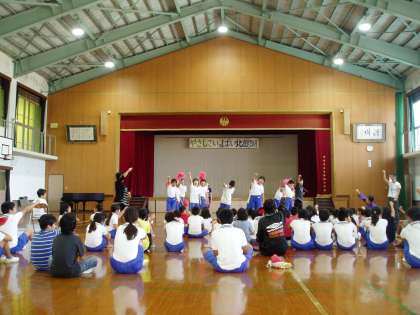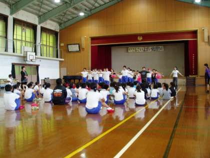 今日の中間休みは,運動会での赤組全員が体育館に集まり,応援練習を開始しました。初日の今日は,応援団長から応援の方法を教えてもらい,掛け声や動きの練習をしていました。