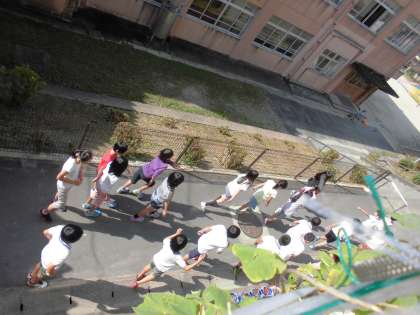 仮想の通報が消防署に入るところからスタートし,消防士が連絡を受けて消防服に着替えたり出動するため整列したりしながら,現場に見立てた運動場の鉄棒にかけつけるまでを行いました。