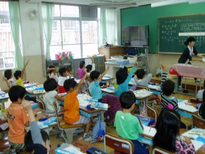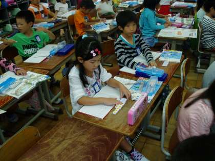1年生の子どもたちは,減ったり増えたりする算数の学習に取り組んでいました。問題を読み,前の学習との違いから今日の学習の『めあて』(学習問題)を知り,絵や自分自身の体やブロックを使いながら問題場面をイメージすることで,立式に結び付けていきます。
