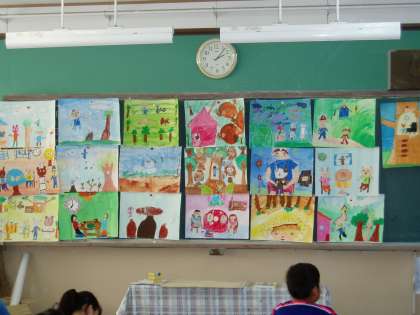 3年生は,自分たちが描いた絵を鑑賞し,お互いの作品の良い所や工夫されているところを見つけて,文章で表現するという学習をしていました。