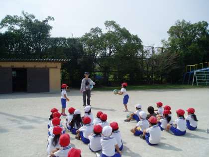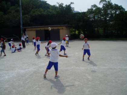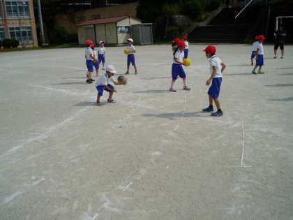 1年生は体育の学習でボールを使って,いといろな投げ方に挑戦していました。下から両手を使って投げたり,片手で上から投げたりしていましたす。
