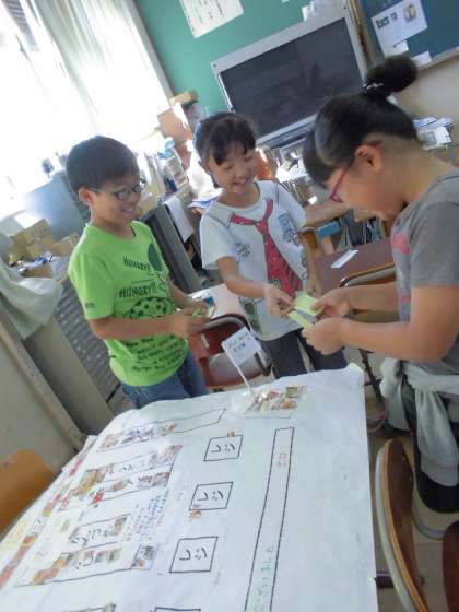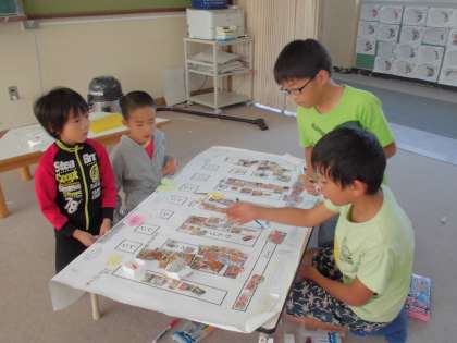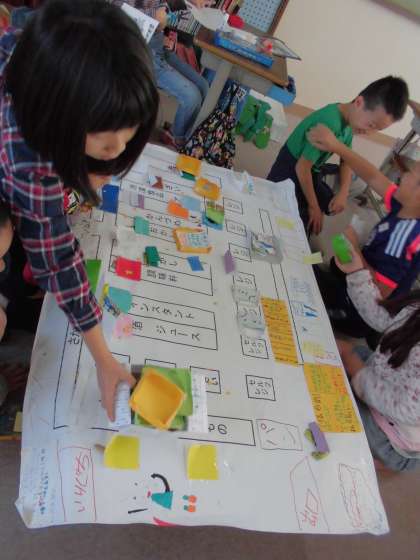 「スーパーマーケットは,お客さんに来てもらうためにどのようなことをするか」をテーマに,各グループで,スーパーマーケットに見立てた紙に,ちらしを使って陳列をしたり,レジやカートの設置をしたりと,話し合いながら様々な工夫を凝らしていました。