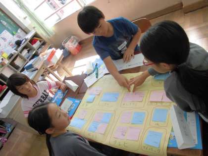 一人一人,日常生活のエコを振り返ったあと,グループで「まずは何を頑張るか」考えあい,次にクラスみんなで発表しあってそれぞれの頑張ることを共有しました。