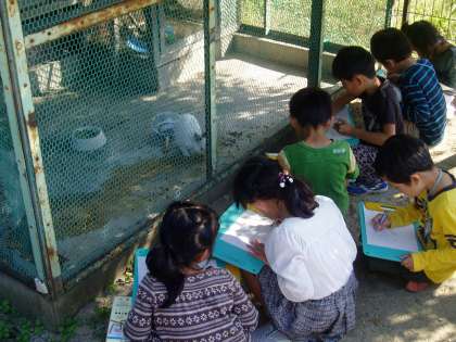 1年生の子どもたちは,生活科の時間に校庭へ出て季節の変化や動植物の様子を観察し,見つけたことを絵カードに書き表していました。