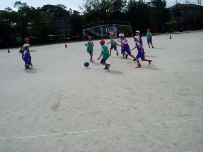 2年生は体育の学習で『パス ゲーム』を始めました。チームでボールをパスでつなぎゴールにシュートをきめる運動です。