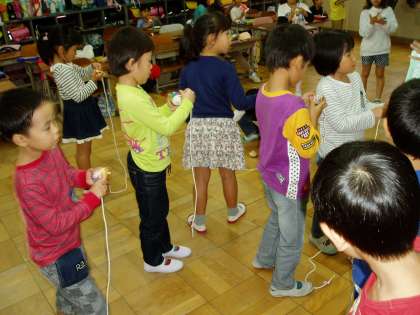 最初はコマにひもを巻きつけることも難しかったようですが,徐々に上手くなってきました。