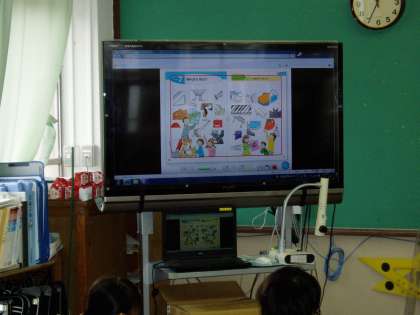 5年生は,外国語活動で「これは,何ですか?」と尋ねたり,その質問に対して返答をしたりする学習に取り組んでいました。