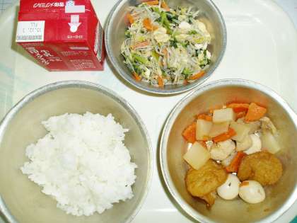 今日は『平天とこんにゃくの煮つけ』『もやしの煮びたし』というメニューでした。『煮つけ,煮びたし』共に,こんにゃくや人参,もやし,油揚げ等の具材が出汁をしっかりとふくみ美味しくいただきました。