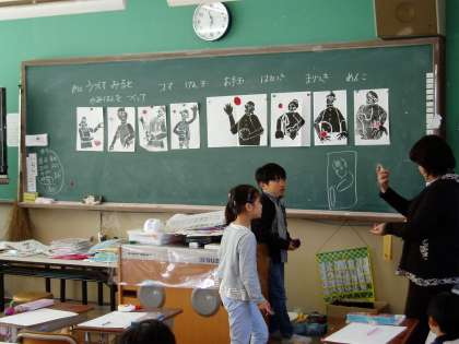 2年生の子どもたちは,紙版画の制作に取り掛かっています。今日は,紙版画の特徴や作り方のポイントを学習したあと,見本を見ながら,作ろうとする動きのあるポーズの下書きを始めていました。