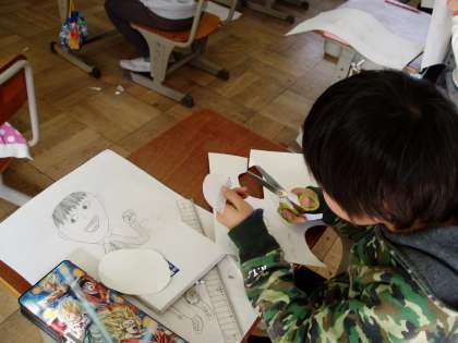 2年生は,図画工作科で鏡や下書きを見ながら,紙版画の版を作るために顔や髪の毛,目や口の形を画用紙から切り出しています。