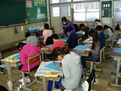 4年生は彫刻刀を使い,版画を彫ることに集中していました。机の上で版画板を回しながら,掘り進む方向を一定にすることを意識していました。