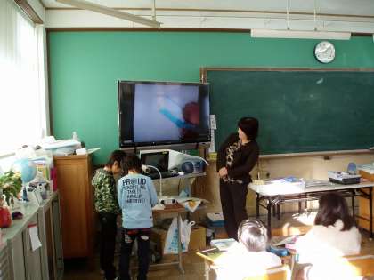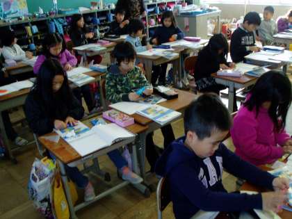 2年生の教室では,算数科の学習で長方形を作り出すことに挑戦していました。前の時間の直角作りをヒントに長方形の折り方を考えています。