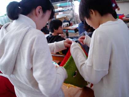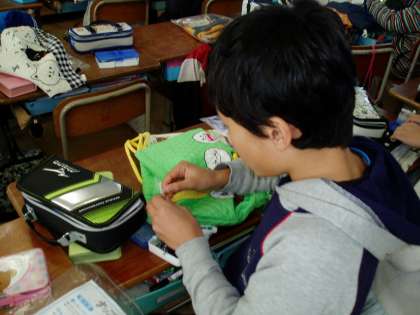 5年生は家庭科の学習で『ナップザック作り』に挑戦しています。子どもたちは,苦労したり,楽しんだりしながらナップザックの完成を目指していました。