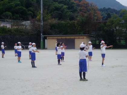 5年生は体育科の学習で『なわとび』を始めました。冬の体力づくりには,ピッタリの運動です。なわとび大会に向けて,いろいろな跳び方も練習します。