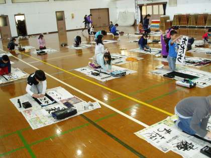 3年生は体育館に新聞紙を敷き,『書初め』をしました。普段は,椅子に腰かけた姿勢で習字の学習をしていますが,今日は体育館で正座した状態から半紙に向かい筆を走らせていました。