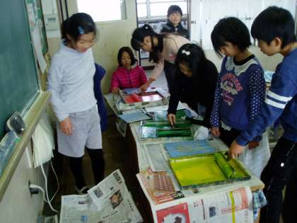 ローラーを使ってまんべんなくインクをつけ,バレンで丁寧に擦っていました。