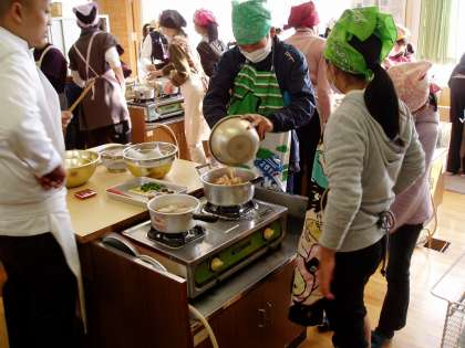 今日のメインでもある出汁は,昆布でひいた出汁の中に火を止めてから鰹節を入れるという手順を確かめながら調理をすすめていました。