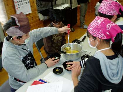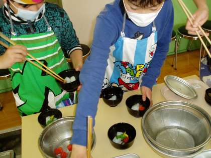 自分が盛り付けたお椀をいただくのではなく,友だちに食べてもらうお椀に盛り付けて出汁をはります。お椀をいただく子どもたちからは,自然な笑顔がこぼれてきました。