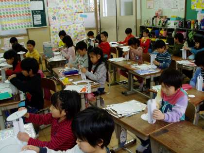 1年生は図画工作科の時間に,コロコロ転がるおもちゃ作りを始めました。今日は,その1時間目で土台となる骨組みを作り上げていました。