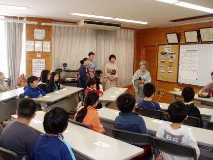 今日の午後は,4年生と2年生がお茶と和菓子の歴史やお茶のいただき方と和菓子づくりの体験をさせていただきました。