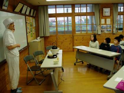 まず,4年生はふれあいサロンでお茶と和菓子の歴史を学び,そのあとにお茶をいただきました。