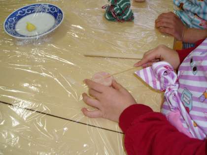 餡を重ねて形を整え,桜の花びらを作っていきます。子どもたちは,次第に出来上がる桜の花びらに喜びいっぱいの満足した表情を見せていました。