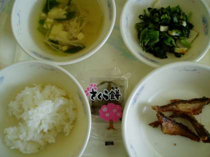 今日は今年度最後の『和(なごみ)献立』です。メニューは『はたはたのこはくあげ』『かまぼこと菜の花のいためもの』『すまし汁』『桜もち』でした。