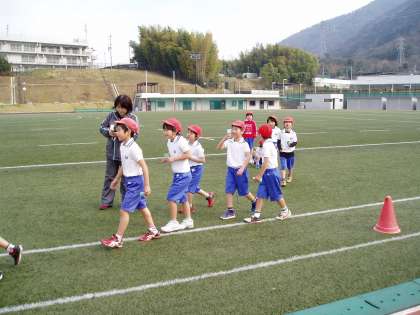 ゴールした後は青空の下,広い広いグランドで鬼ごっこをして楽しみました。人工芝で楽しそうに駆け回り,大きな歓声が響きました。