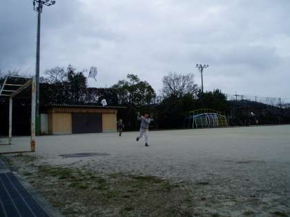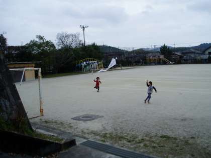 1年生は図画工作科の時間に作った凧を運動場であげました。元気な1年生は,凧糸を片手に運動場を駆け回っています。