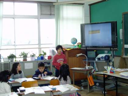 2年生は,折り紙を使って面積の学習をしています。折り紙を折って,元の面積の半分を作ります。出来上がったものをテレビに映しながら,どのように折れば半分の面積になるのかを説明しています。