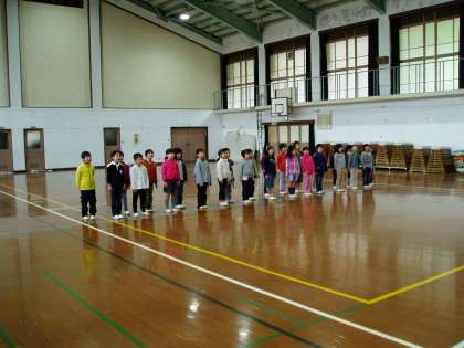 明日の『6年生を送る会』に備えて,1年生は体育館で練習をしました。お祝いの言葉,プレゼントする歌の練習に加え並んで歩く練習も,しっかりできました。