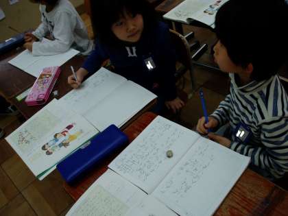 1年生は国語科の時間に,1年間の出来事を思い出して作文を書いています。楽しかったことが,いっぱいで何を書こうかと友だちに相談したり,一生懸命に書き綴ったりする姿が見られます。