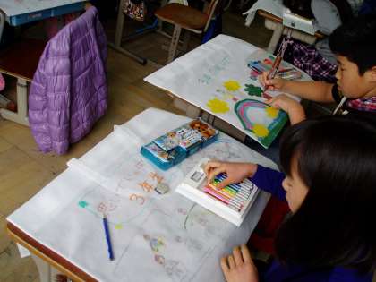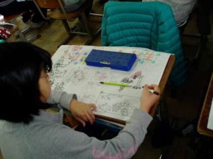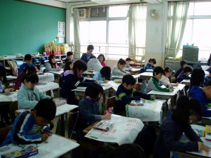 3年生は図画工作科の時間に,作品を持ち帰るための作品バックにデザインをしています。たくさんの子どもたちが,3年生で心に残った行事や出来事をのびのびと描いていました。