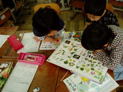 今日は自分たちが育てようとしている野菜について,図鑑を使いその特徴や育て方などを調べていました。