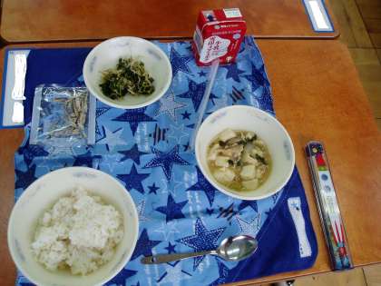 今日の給食は『とうふのそぼろ煮』『ほうれん草ともやしのごま煮』に『じゃこ』が添えられました。