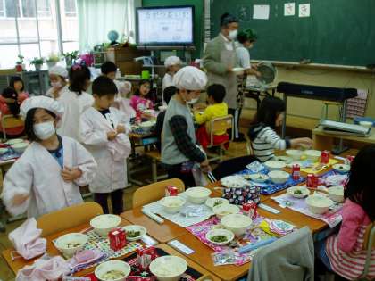 1年生の給食当番さんは,配膳が終わると上手にエプロンをたたみ,素早く後片付けを済ませることができています。