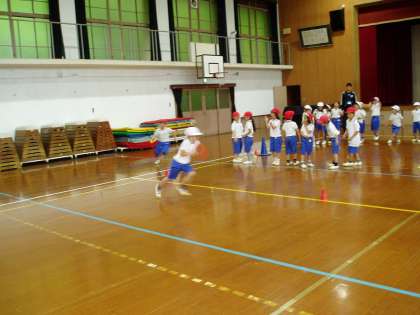 1年生の体育は,体育館で『リレーあそび』をしました。昨日,今日と雨のために運動場で体を動かすことができなかった分,しっかり走ってリレーを楽しんでいました。